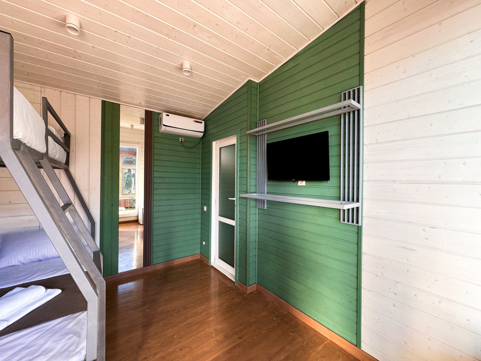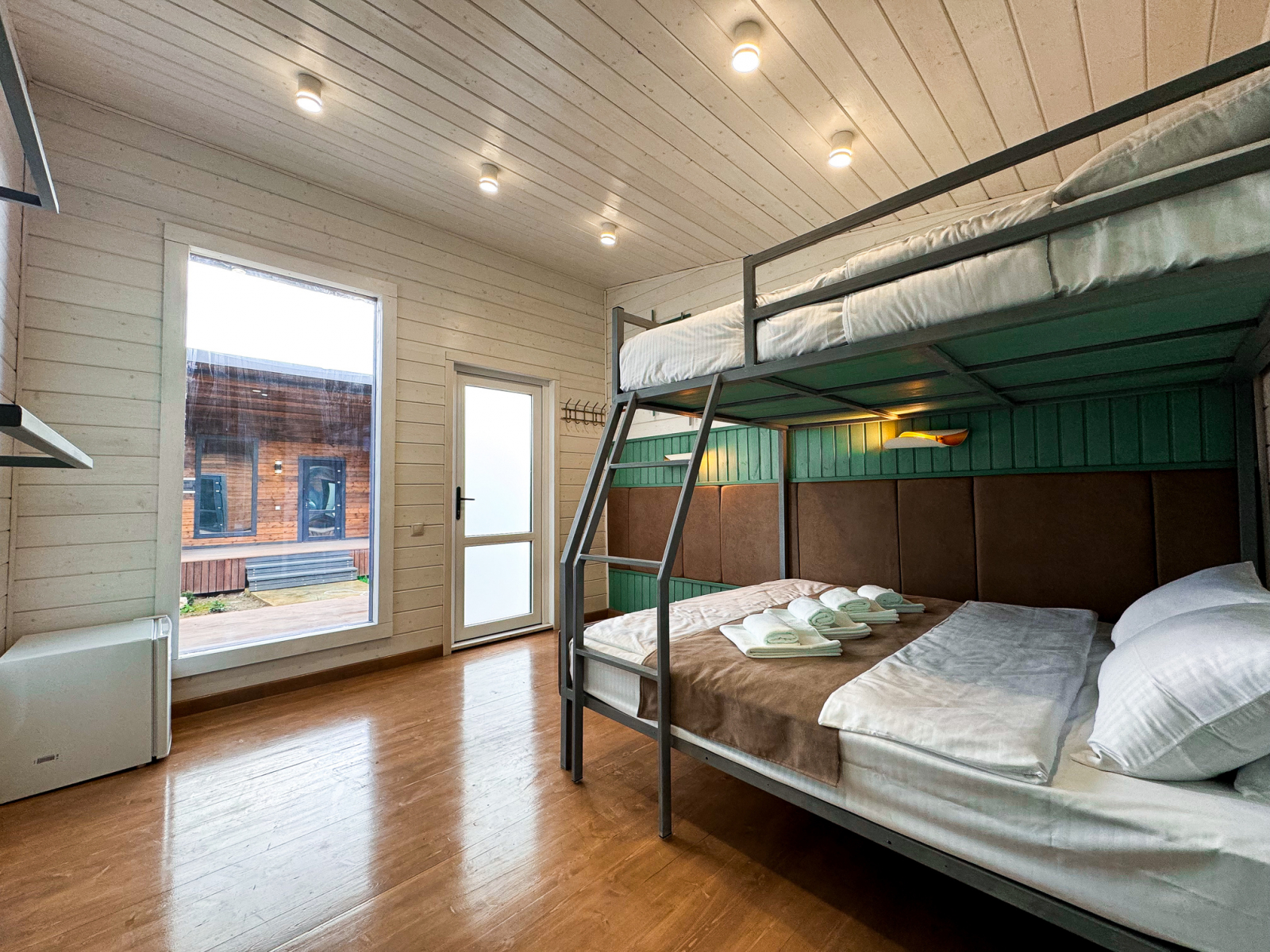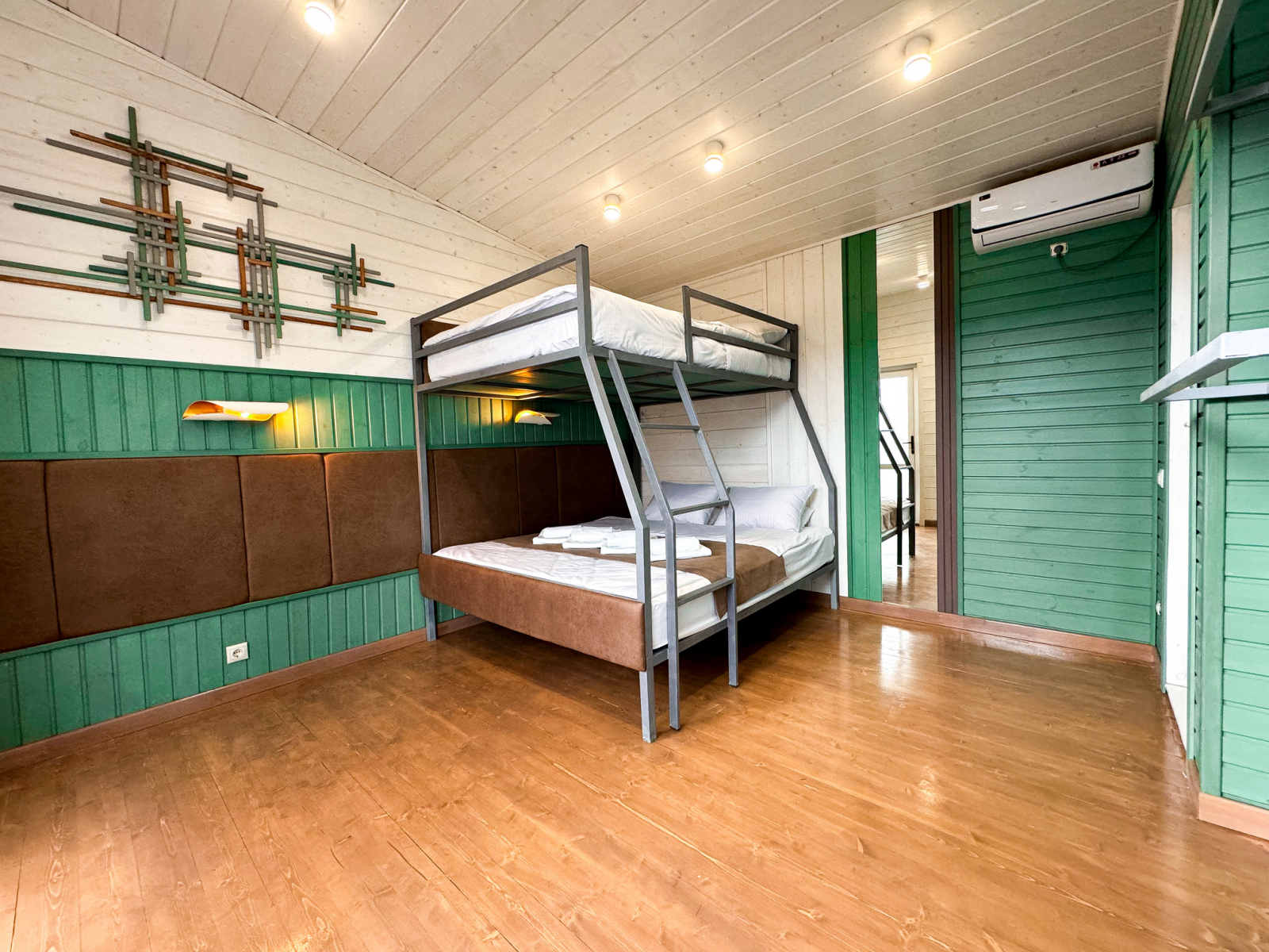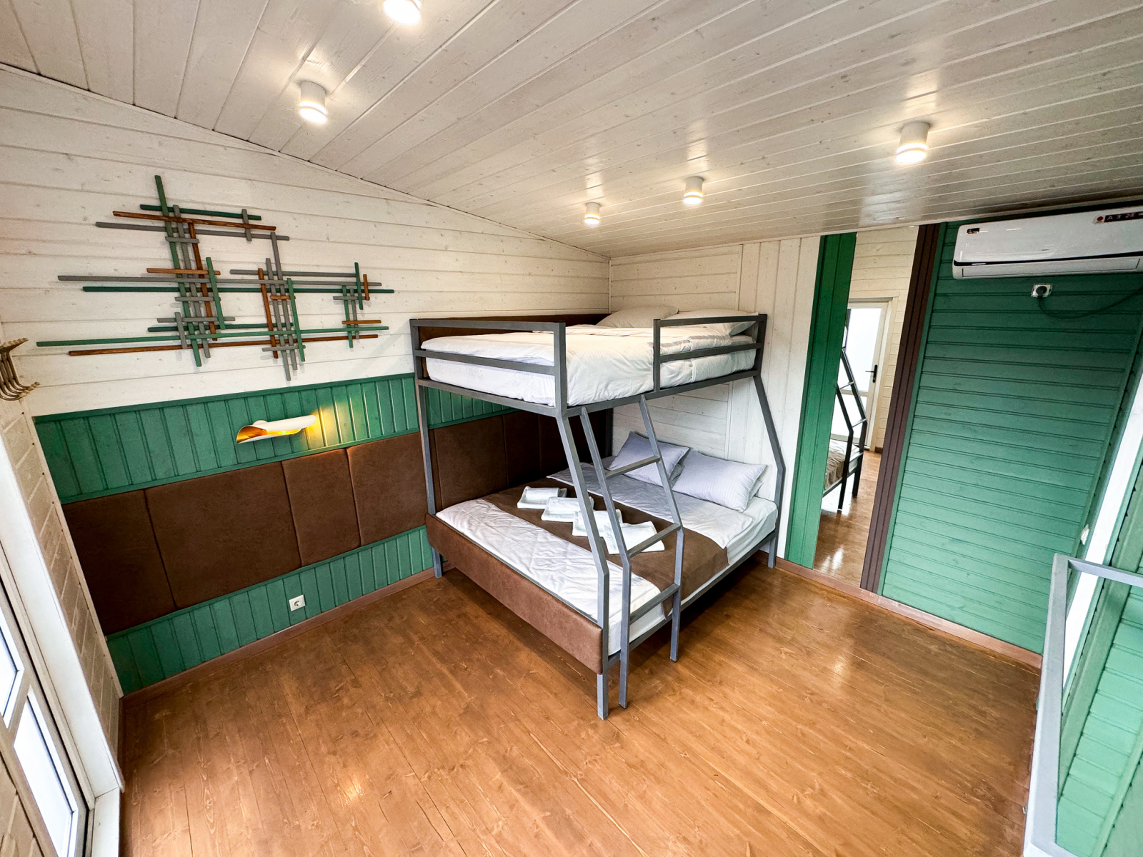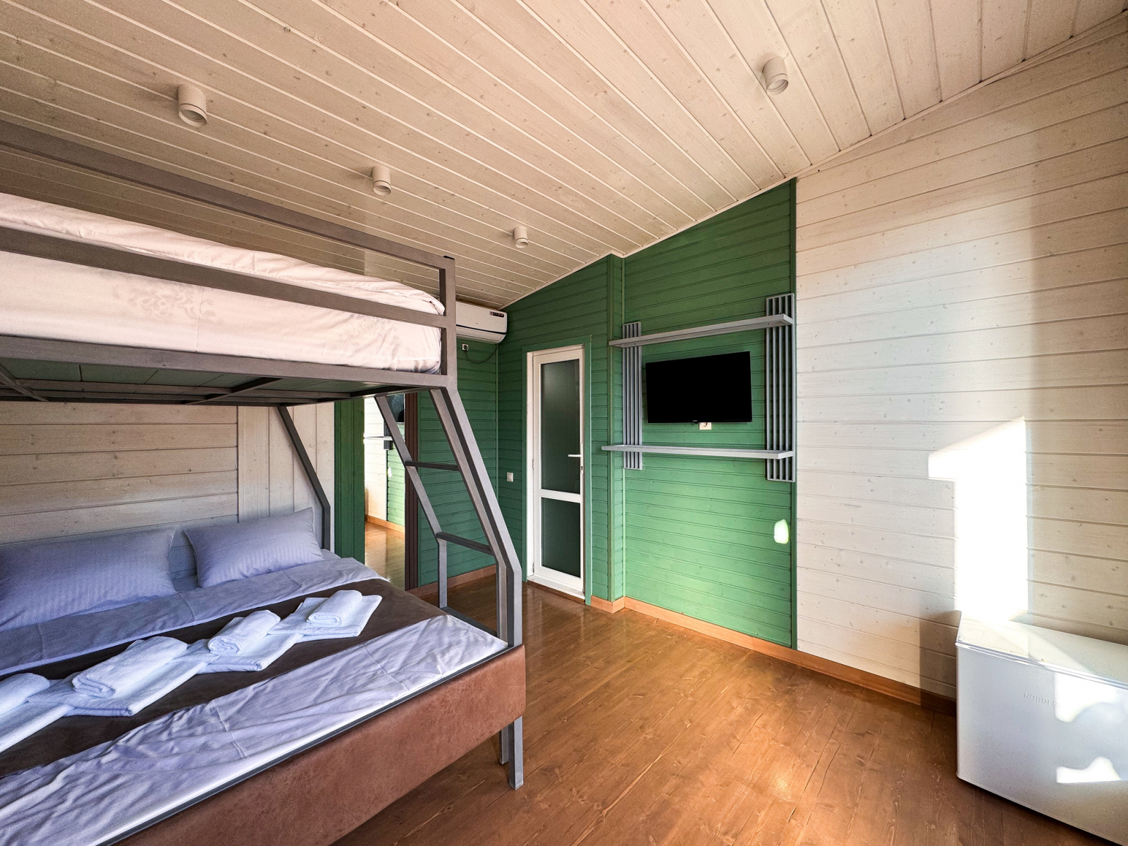 4 осн. места. Мебель: вешалка, зеркало, кровать двухъярусная (ширина (см): 180 низ, 140 верх; либо двухъярусная 100 и 80 и 2-спальная кровать 160; либо двухъярусная 140 и 100 и 1-спальная кровать 90), прикроватные тумбочки, шкаф. Оборудование: кондиционер, телевизор, холодильник. Санузел. Сервис: Wi-Fi бесплатно, смена полотенец, смена постельного белья, уборка номера.